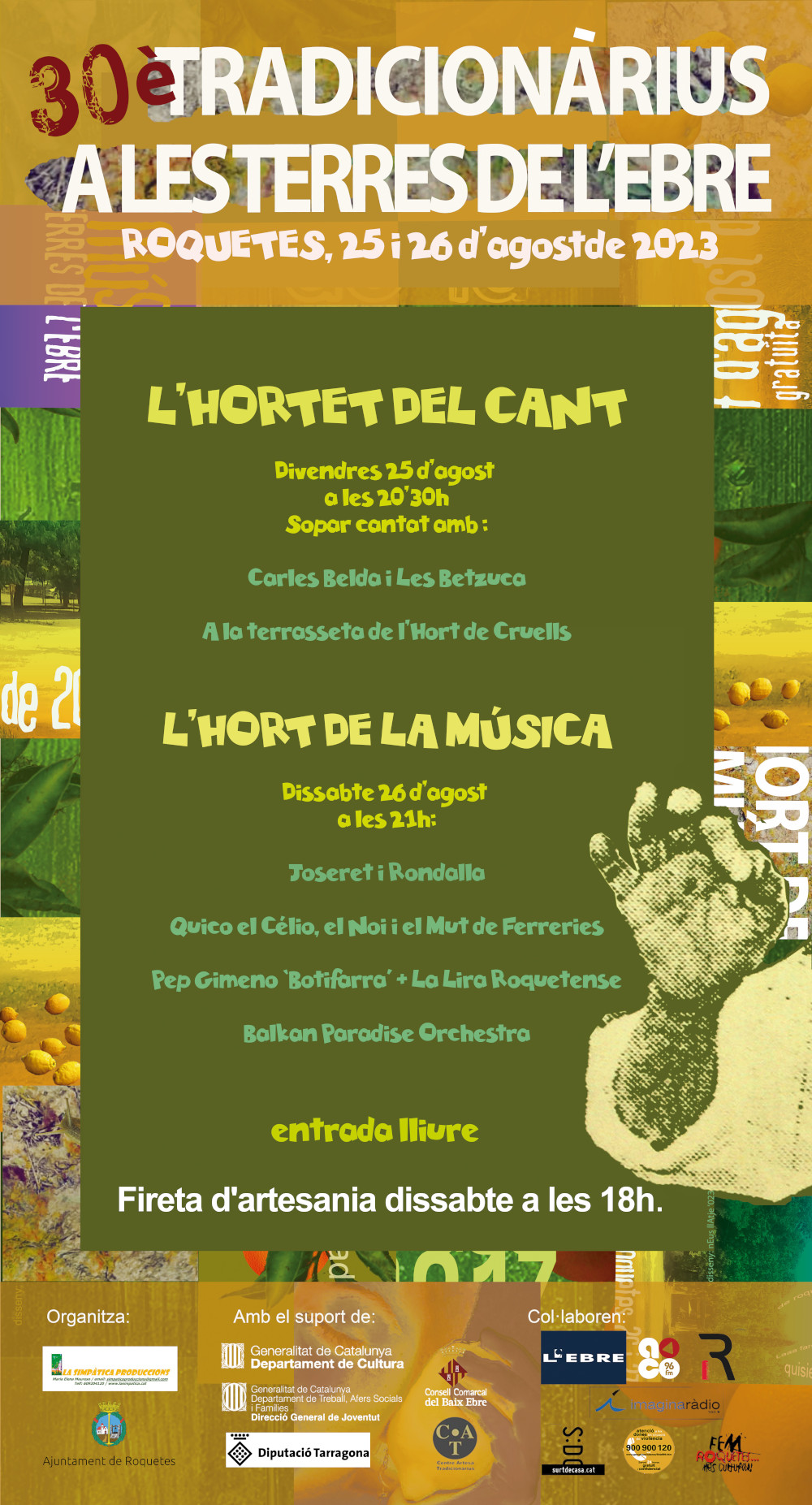 30è Tradicionàrius a les Terres de l’Ebre El pròxim 25 i 26 d’agost es durà a terme a l’Hort de Cruells el 30è Tradicionàrius a les Terres de l’Ebre. Us esperem! Data 25 - 26 ag. 2023 Caducat! Hora Activitat de tot el dia Localització Hort de Cruells Hort de Cruells Categoria Agenda