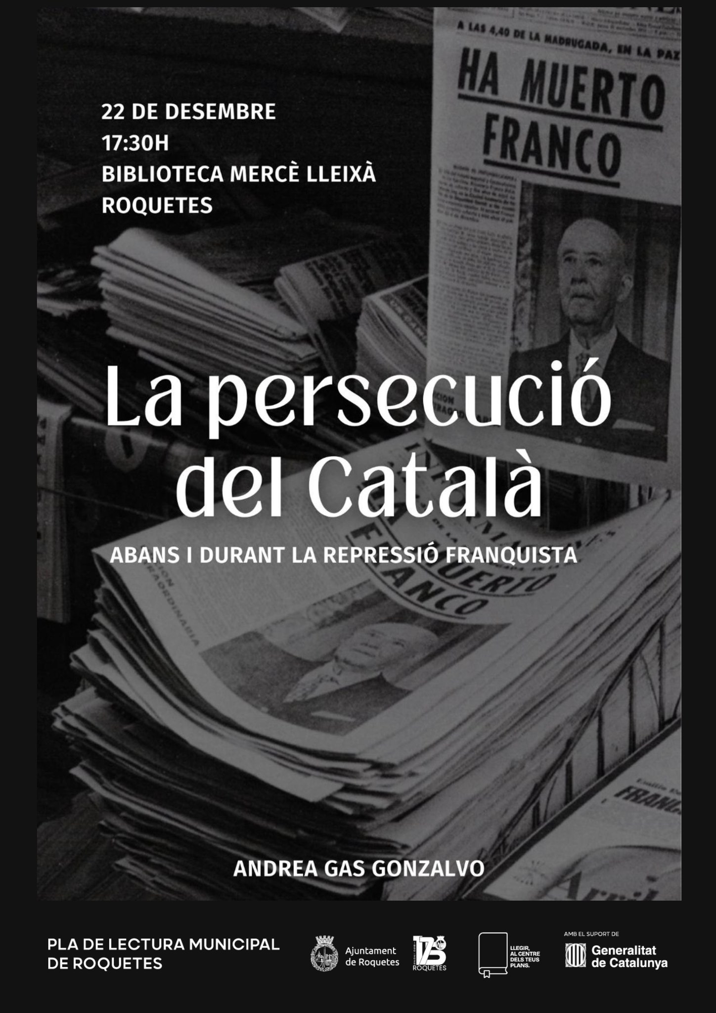 Presentació ‘La persecució del català, abans i durant la repressió franquista’, a càrrec d’Andrea Gas Data 22 des. 2025 Caducat! Hora 17:30