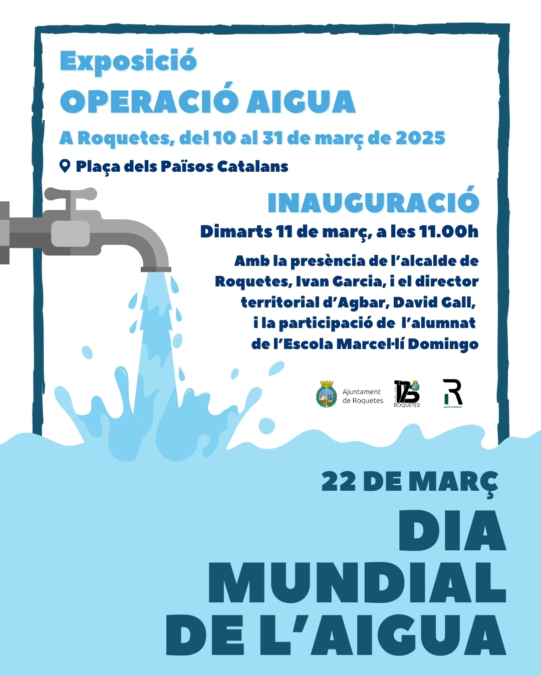 El mes de l’aigua. Roquetes dedicarà aquest març a reflexionar sobre la importància de l’aigua i com tenir-ne cura, a través de l’exposició ‘Operació Aigua’, que es podrà veure des del pròxim dilluns 10 fins al 31 de març, de forma permanent, a la Plaça dels Països Catalans.