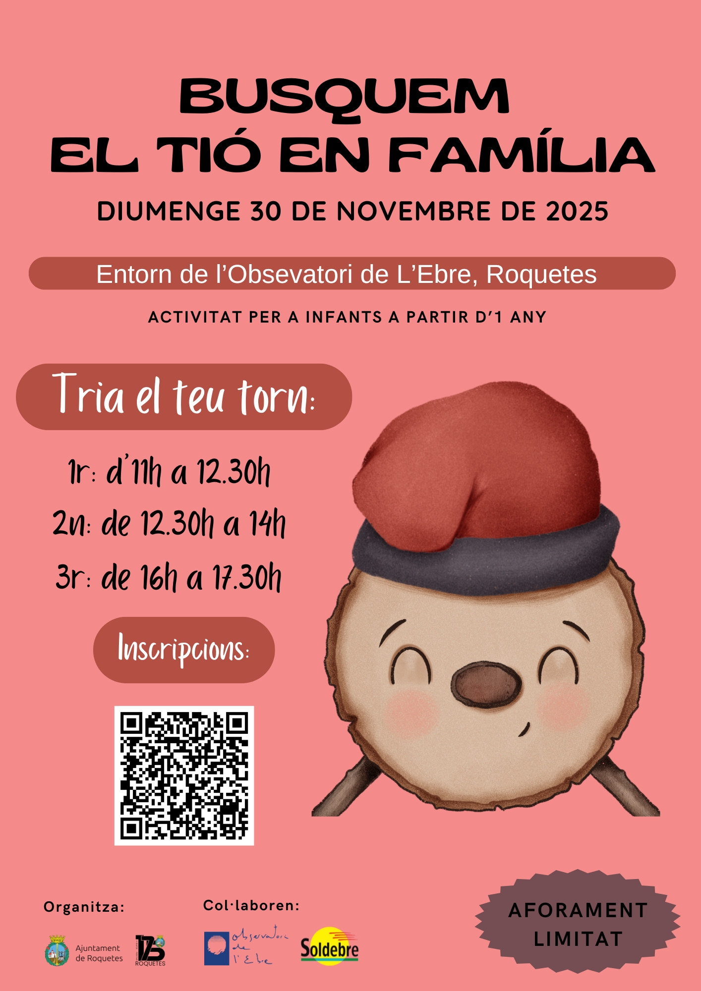 S’acosta el Nadal, per a petits i grans. Un nou any, Roquetes acollirà l’activitat ‘Busquem el tió en família’, el pròxim diumenge 30 de novembre, a l’entorn de l’Observatori de l’Ebre. Els nens i nenes podran buscar el tronc acompanyats per la seva família, en una activitat dirigida a infants a partir d’un any, i amb aforament limitat. Hi haurà tres torns diferents, perquè cadascú pugui escollir el seu: d’11.00h a 12.30h, de 12.30h a 14.00h, o bé de 16.00h a 17.30h.
