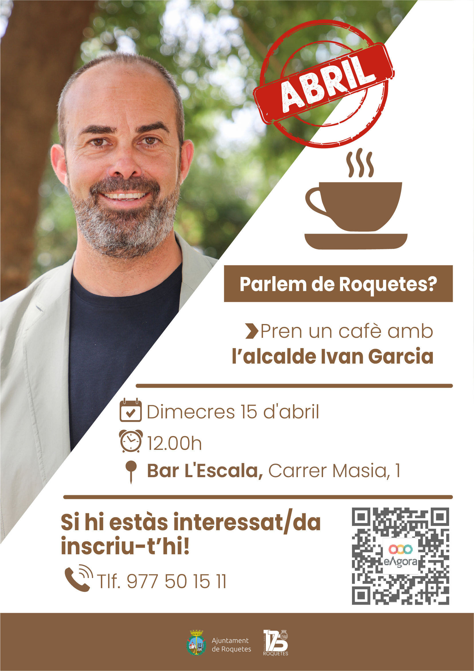 Proximitat amb la ciutadania, amb una conversa de tu a tu. La iniciativa ‘Cafè amb l’alcalde’ continua el seu recorregut per Roquetes, i farà la següent parada el pròxim dimecres 15 d’abril, a les 12.00 hores, al bar L’Escala (Carrer Masia, 1). L’establiment acollirà la dotzena trobada del batlle de la ciutat, Ivan Garcia, amb els veïns i veïnes de la població, per tractar temes d’interès municipal de forma oberta i transparent.