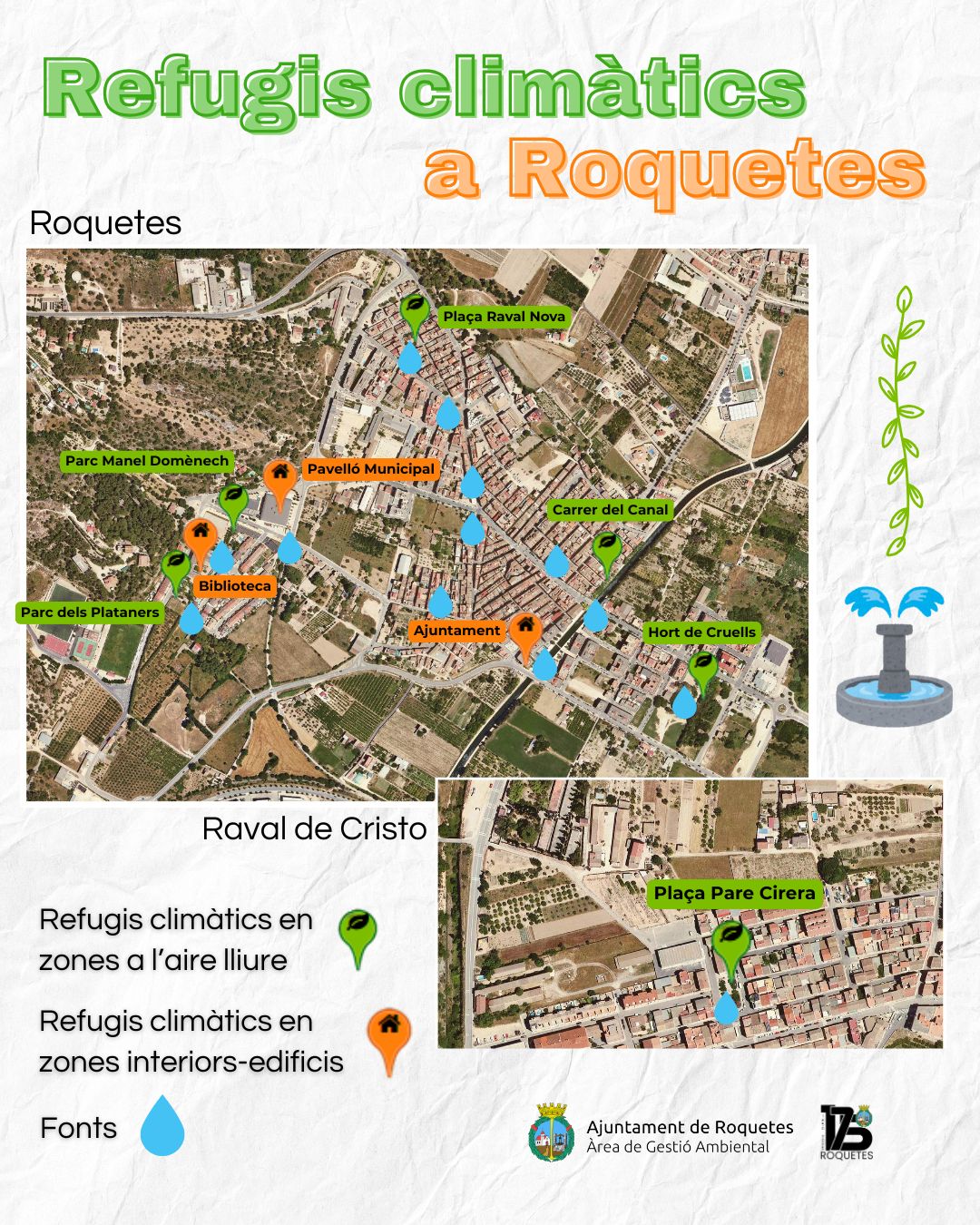 La ciutat presenta un total de 9 refugis climàtics, entre interiors i exteriors, a més de 13 fonts públiques d’aigua, al nucli urbà i La Ravaleta.