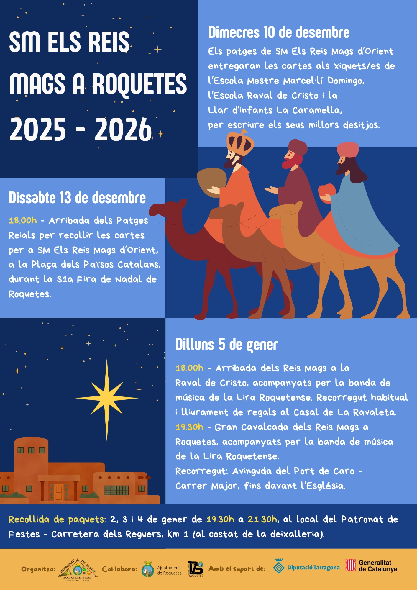 La recollida de paquets als ajudants dels Patges Reials serà els dies 2, 3 i 4 de gener, de 19.30 hores a 21.30 hores, al local del Patronat de Festes de Roquetes, situat al quilòmetre 1 de la carretera dels Reguers, al costat de la deixalleria. 😉