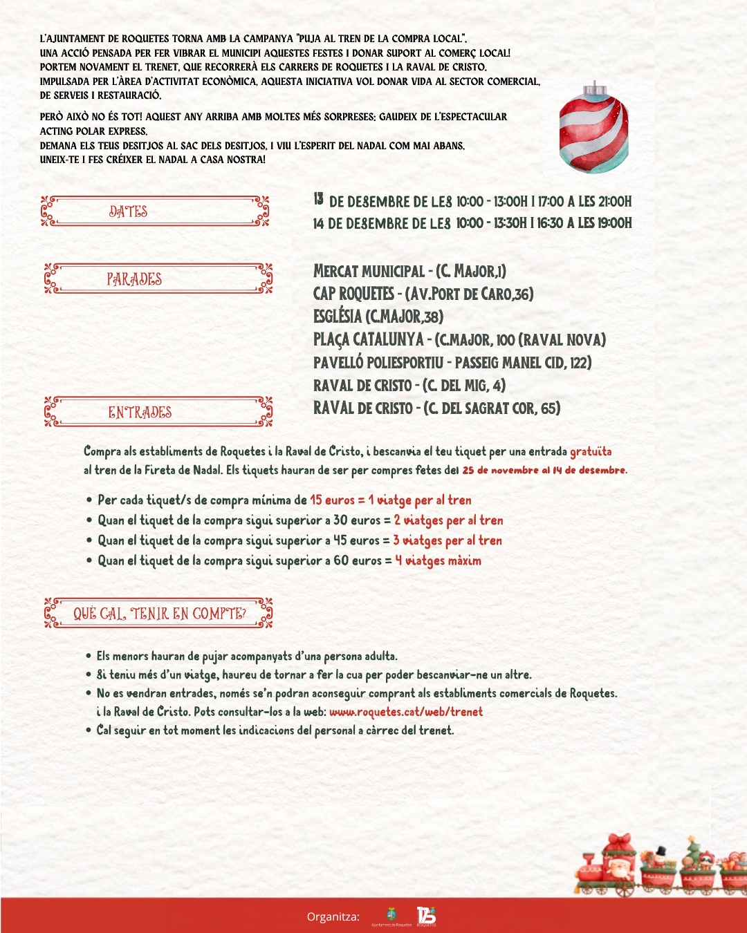 S’acosta un dels esdeveniments més esperats de l’any. Amb l’objectiu de donar suport al comerç de la ciutat, Roquetes engega un nou any la campanya ‘Puja al tren de la compra local’, coincidint amb les setmanes prèvies a la 31a Fira de Nadal de la ciutat. Fins el 14 de desembre –o fins a esgotar existències–, els establiments de Roquetes i la Raval de Cristo adherits a la iniciativa lliuraran un tiquet gratuït per viatjar amb el Polar Express, per cada compra superior a 15 euros.