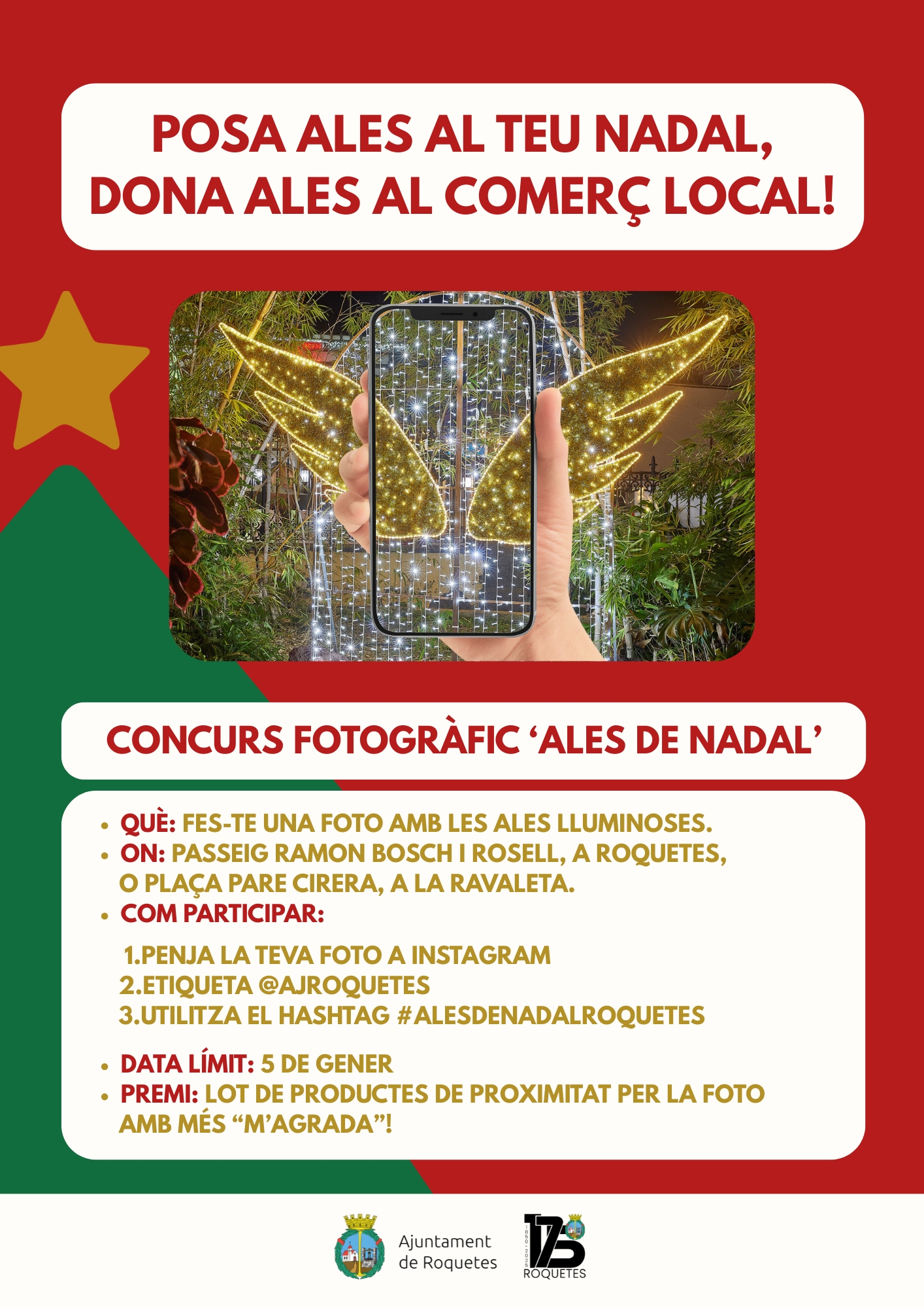 Les dates nadalenques arriben carregades de sorpreses i novetats. Roquetes estrena el concurs d’Instagram ‘Posa ales al teu Nadal’, per impulsar el comerç local i promoure la dinamització econòmica a la ciutat. La campanya, promoguda per l’Àrea d’Activitat Econòmica de l’Ajuntament, s’estrena aquest divendres, coincidint amb l’acte de l’encesa de llums i l’arribada del Pare i la Mare Noel, i s’allargarà fins el proper 5 de gener. El premi serà un lot de productes de proximitat, per la foto amb més ‘M’agrada’.